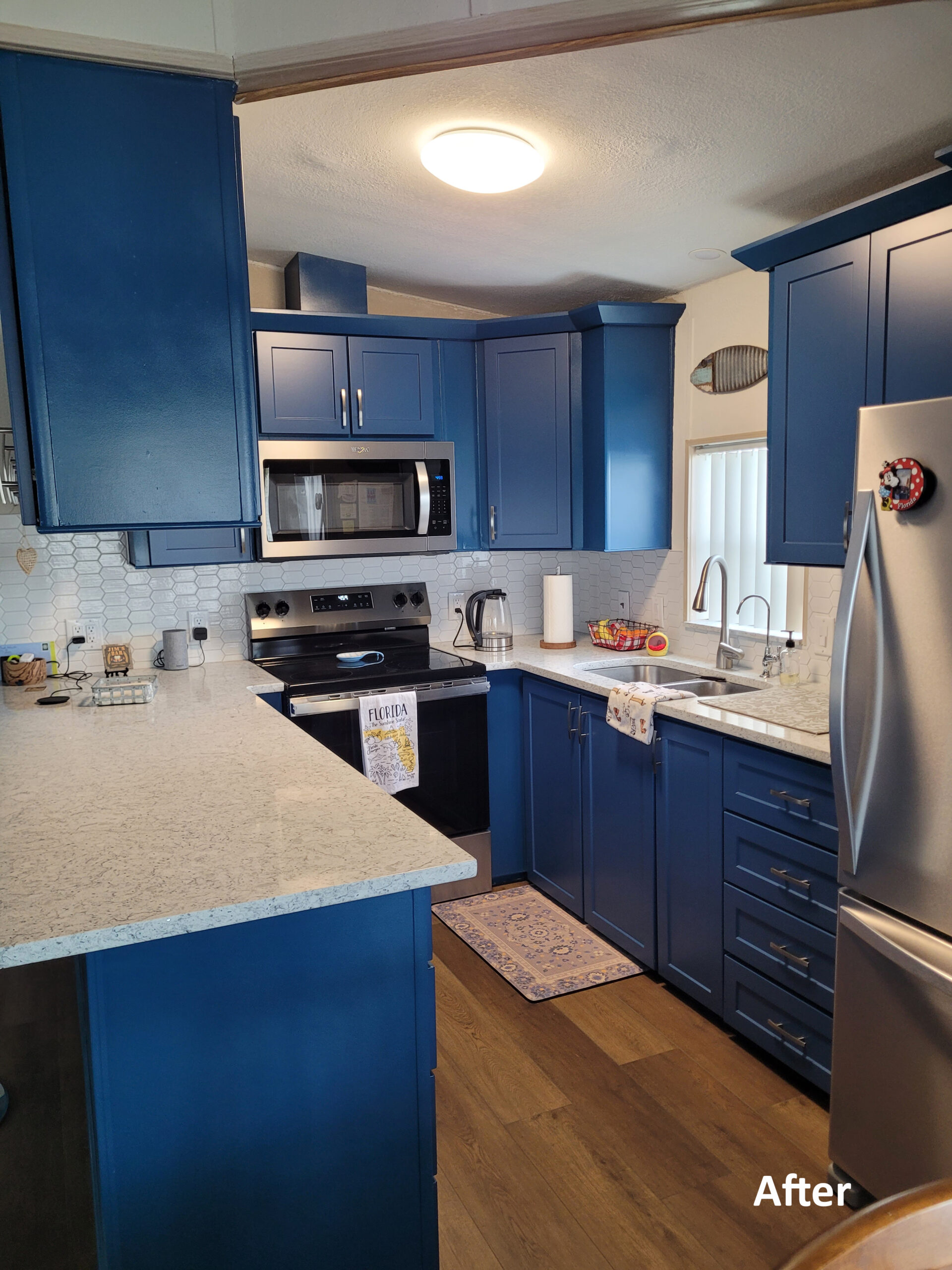 Our clients contacted us to help them update their outdated kitchen. They wanted to go with something a little more modern for the cabinets and countertops. They decided to go with our Mission shaker door in a Blue  Danube color. For the countertop, they went with a Bianco Flora quartz, while the new backsplash was done in the Omni white flossy picket mosaic design. A new kitchen that our clients are thrilled to show to their family and friends.