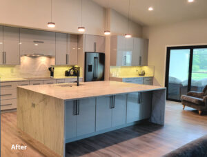 We then moved the stove and refrigerator to their new locations. For the new cabinets, they went with the Manhattan flat panel high gloss metallic door in a gray color. Now this is truly a beautiful kitchen transformation.