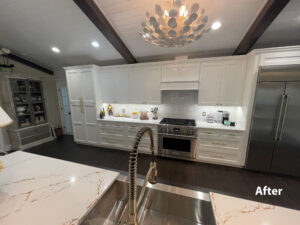 They decided to go with the Carson door style with a square edge in a linen white color. To finish this transformation, we installed a new Lusso quartz countertop, and we also did the fireplace face in the same quartz material. Now our clients have the show stopping kitchen they were looking for.