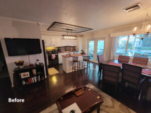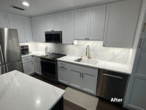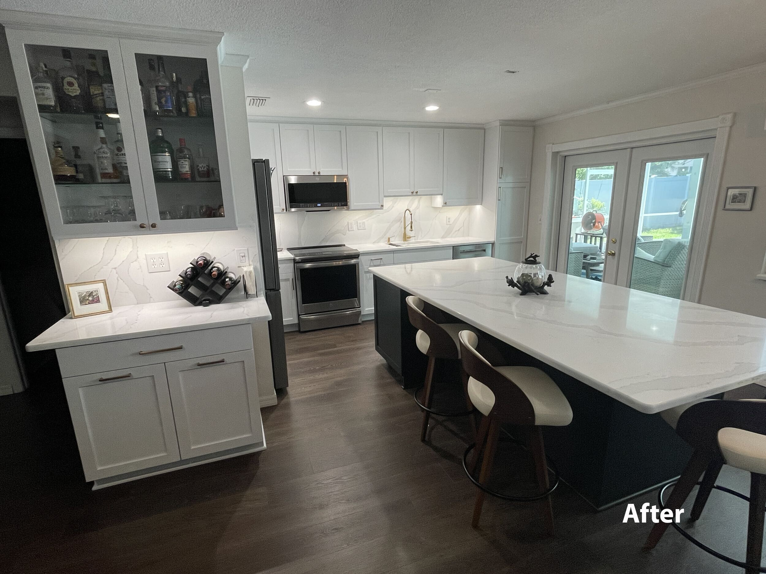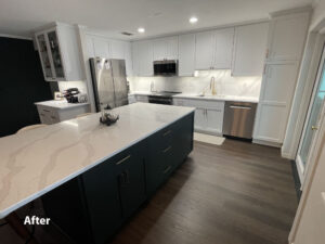 Our clients contacted us for help in designing their new kitchen. They were looking to change their existing island to something more functional. They were also looking to add some additional storage space.  The new cabinets that we installed were done in a shaker door style from our Kitchen Solvers Legacy Collection in a two-tone color. The kitchen cabinets were done in a classic white, while the island was done in hunter green. Next, we installed a new Calacatta Oro quartz countertop and backsplash. Just look at this beautiful new kitchen!