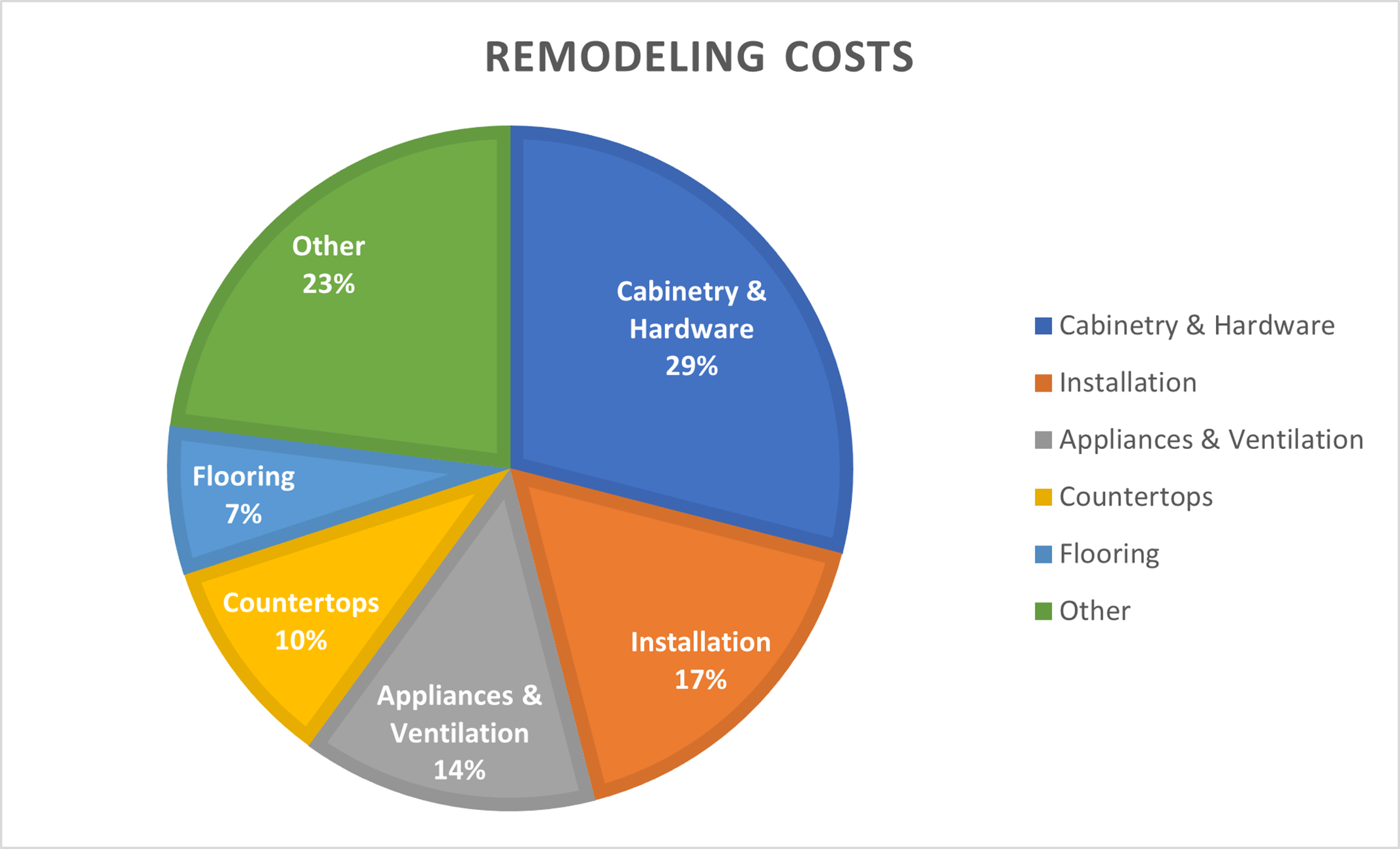 The 2022 Cost vs. Value Report by Remodeling Magazine shows the average “minor kitchen remodel” is $28,279 and the average “major kitchen remodel” (mid-range) is $80,809. Another great resource to look at would be HomeAdvisor’s True Cost Guide for Kitchen Remodels. Here they break down the costs of specific parts of the project and the average amount you can expect to pay for each. The average $28,279 expense will primarily go to the cost of cabinets, appliances, and installation. Below is a breakdown of which parts of the remodel the funds can be expected to go towards: