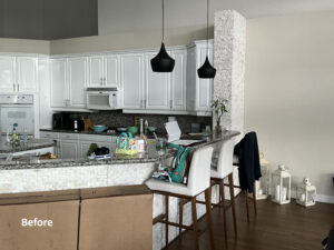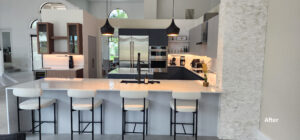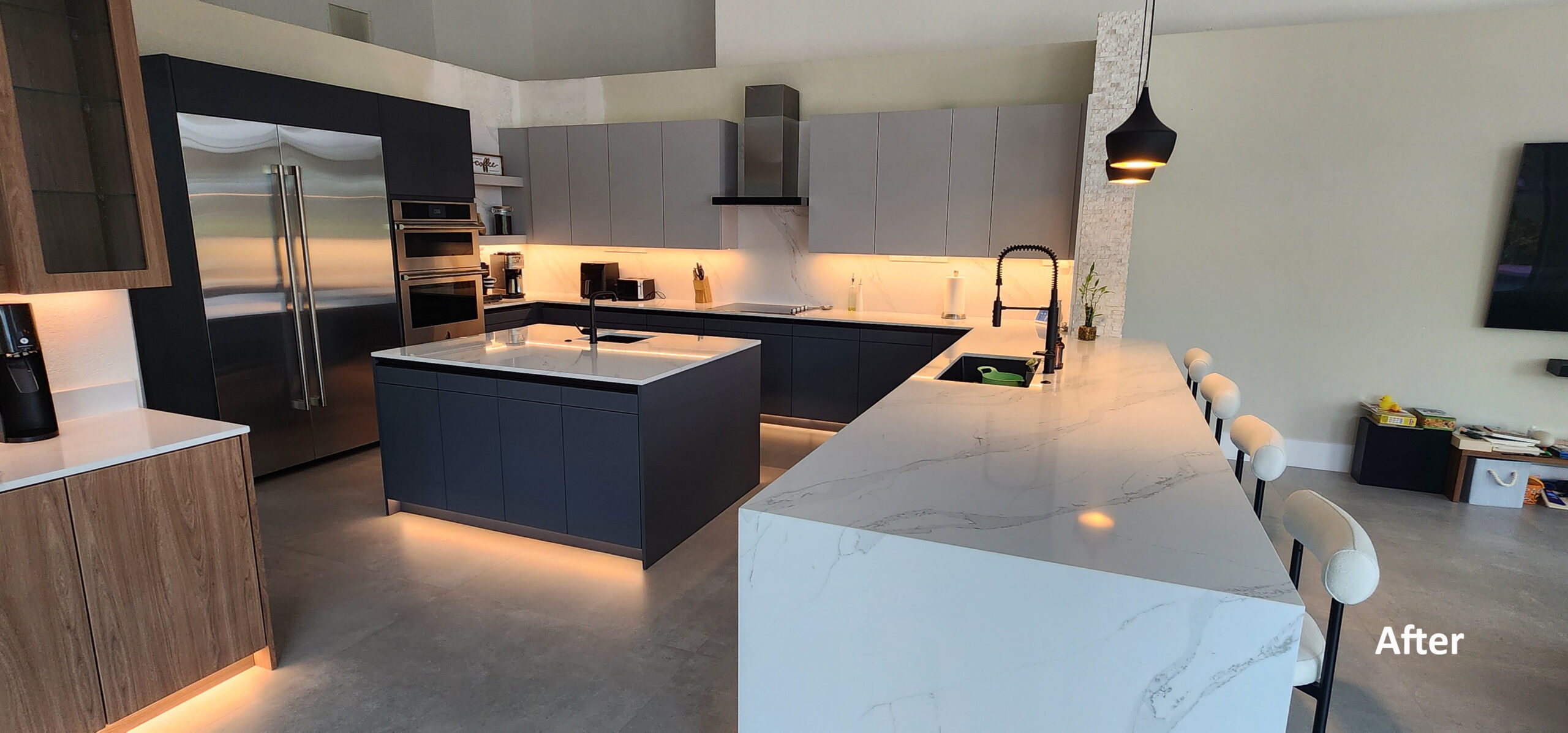 The curved pantry was demolished and replaced with a straight one, which allowed us to add cabinetry on the side facing the family room to create a coffee station and bar space. The center island and peninsula were also reworked and enlarged. On the peninsula, the unevenness was also removed and everything was left at a single height, which allowed us to place a waterfall at the end with a book-match between the top and the waterfall itself.  The old oven tower in the diagonal corner was also removed, and those walls were refinished. A 48″-wide Sub-Zero refrigerator was added, and a new oven tower was installed, expanding and making the kitchen workspace more efficient. The wall cabinets above the cooktop were removed, and a range hood was installed. A full backsplash was installed across the entire surface, matching the Unique Calacatta countertop. Pullouts were added to the cabinets, and all doors are now one-touch opening. To complete the look, LED lights were installed under the wall cabinets and in the base cabinets as well.