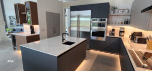This major remodel not only included changing the kitchen layout but also the design and function of the large living room. Walls were removed, integrating and modernizing the living room space. New steps were built to follow the shape of the living room. The entire floor was replaced with 48″ x 48″ light gray porcelain tile, giving the space more spaciousness and light. The new steps at the lower level of the living room were made with straight nosings, and a continuous LED light was hidden underneath, enhancing the space with a scenic effect. The kitchen was also modernized.