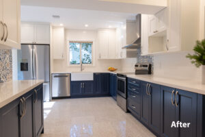 For the new cabinets, they went with our Portland door from our Kitchen Solvers Classic Collection line. The upper cabinets were done in white, while the lower cabinets in a naval color. We next installed an eye-catching Santa Monica Warm Deco backsplash for the hood area, while the rest of the kitchen was done in a Bianco glossy porcelain subway tile. To finish this new kitchen transformation, we installed a new iconic white quartz countertop. Now these homeowners have the kitchen of their dreams.